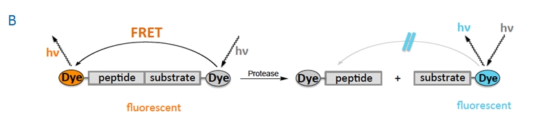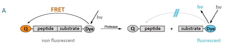 Peptides labeled with FRET systems are often used in fluorescent protease assays. In this system, a protease substrate is labeled at two positions with a corresponding FRET pair. Upon proteolytic cleavage, the FRET partners are separated and the FRET effect is suppressed. Fluorescence is generated (A: in case of a quencher) or shifted to different wavelengths (B: in case of two fluorophores). This enables a positive readout with a high signal-to-noise ratio.