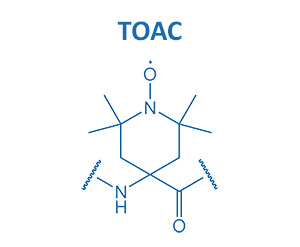 BIOSYNTAN offers two different types of spin labels. TEMPYO can be attached N-terminally or to any other amino group present in the peptide. TOAC can be used analogously to any amino acid building block, and can be placed at any position of the peptide.