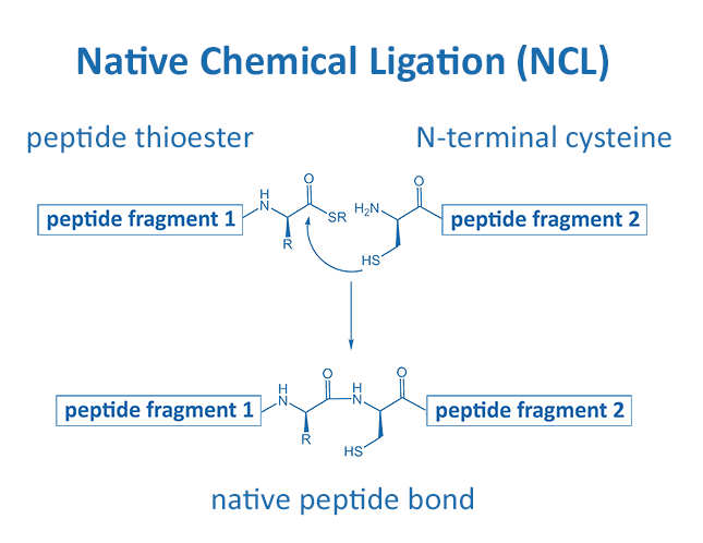 Introduced in 1994 by S. B. Kent, Native Chemical Ligation (NCL) is the most popular of the ligation reactions, particularly for the chemical synthesis of longer peptides or even proteins. The two necessary components are a C-terminal peptide thioester and an N-terminal cysteine. Both react via a transthioesterification step in order to form a native peptide bond. This reaction proceeds selectively in aqueous solvents at neutral pH. Such properties make NCL very suitable for biochemical applications.